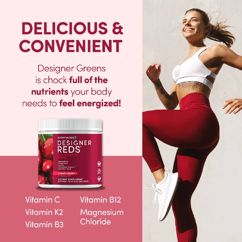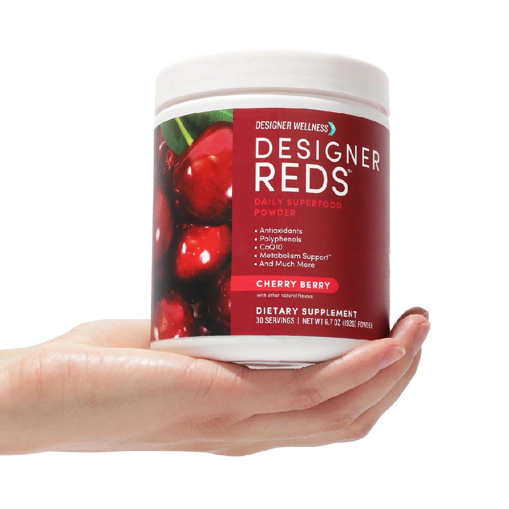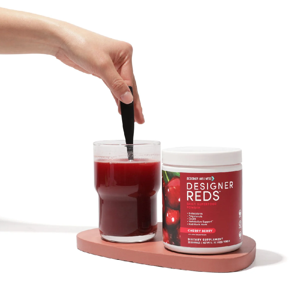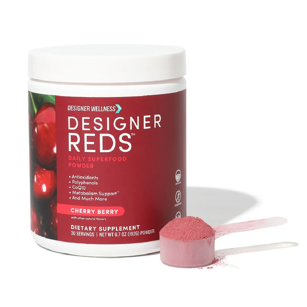 The Designer Reds Powder is a superfood blend rich in antioxidants and polyphenols, crafted to support overall wellness. This vibrant powder combines organic beet root powder, tart cherry extract, grape seed extract, and more to deliver a nutritional powerhouse in every scoop. It's designed for those seeking a gluten-free, non-GMO, and vegan-friendly option to enhance their health regimen.