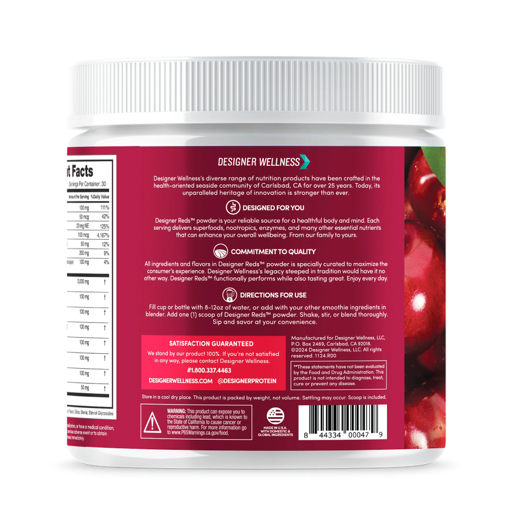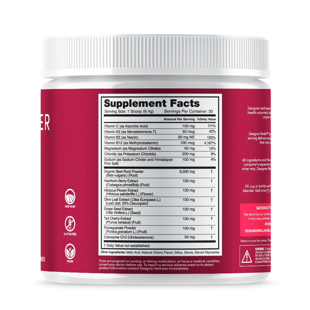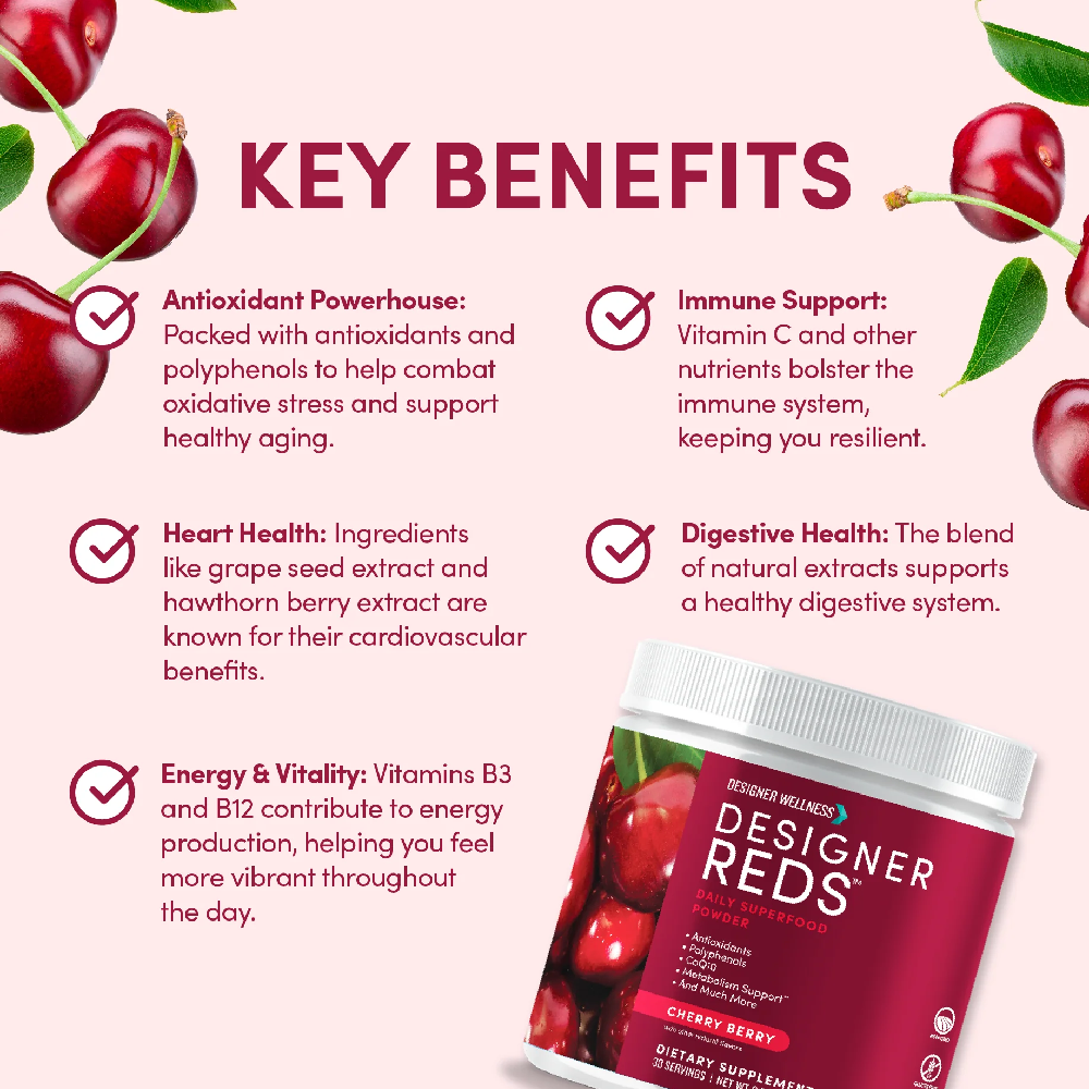 Designer Reds Powder is formulated to provide a rich source of antioxidants and polyphenols, supporting heart health, energy levels, and overall wellness.