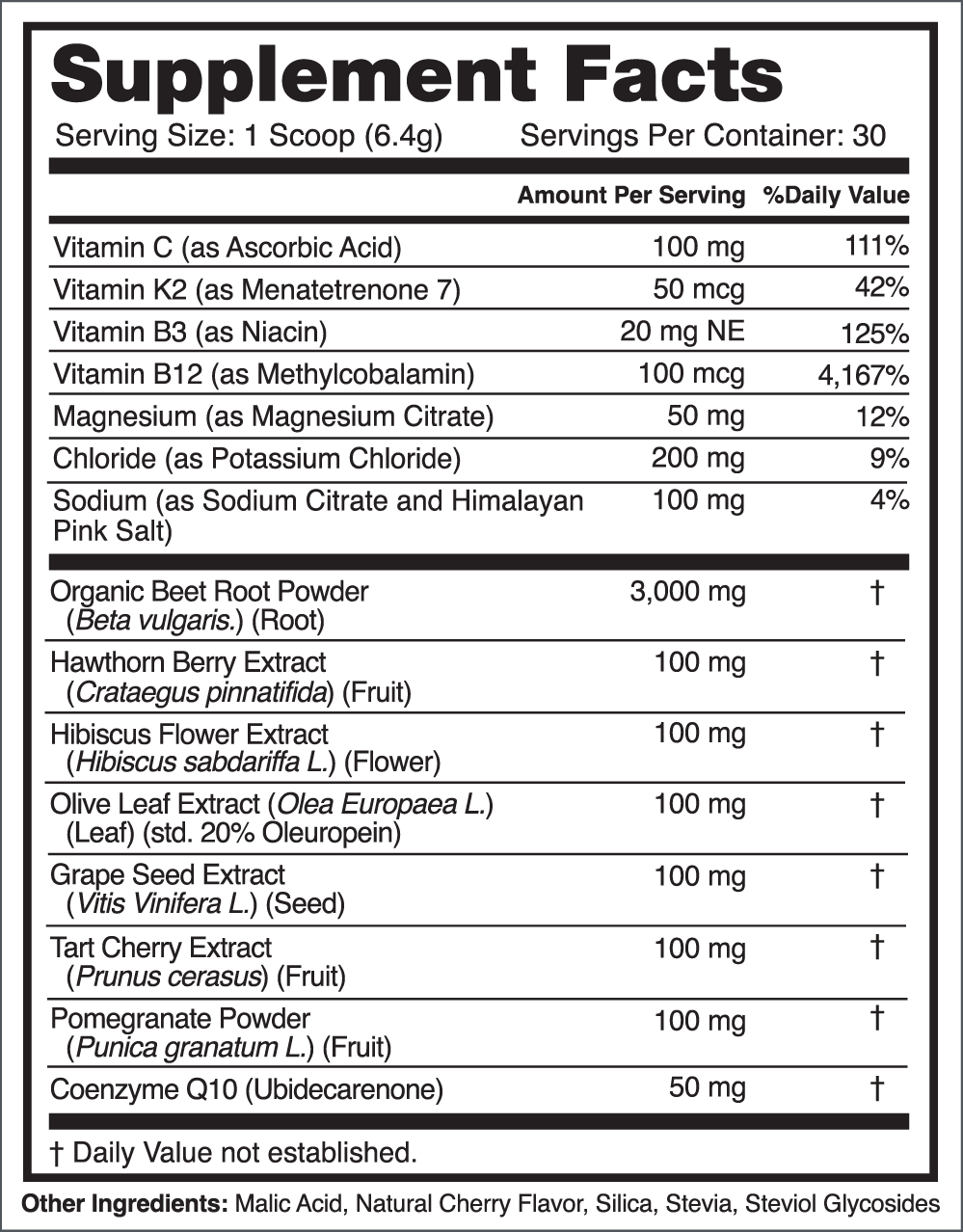 Organic Beet Root Powder, Pomegranate Powder, Tart Cherry Extract, Grape Seed Extract, Olive Leaf Extract, Hibiscus Flower Extract, Hawthorn Berry Extract